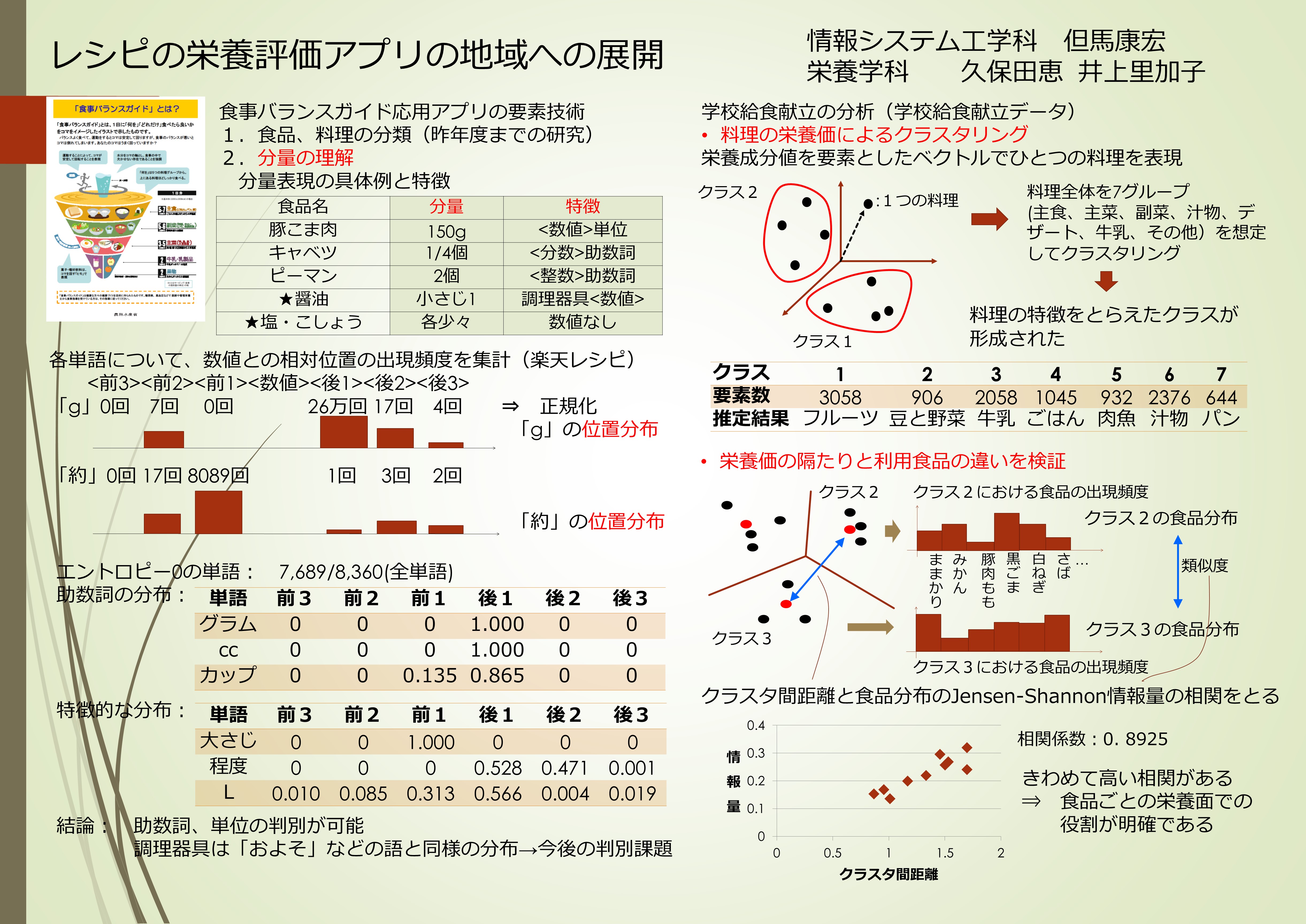 また,学校給食の献立データから一品の料理がもつ栄養価の分布を分類し,食材ごとの栄養価における役割が