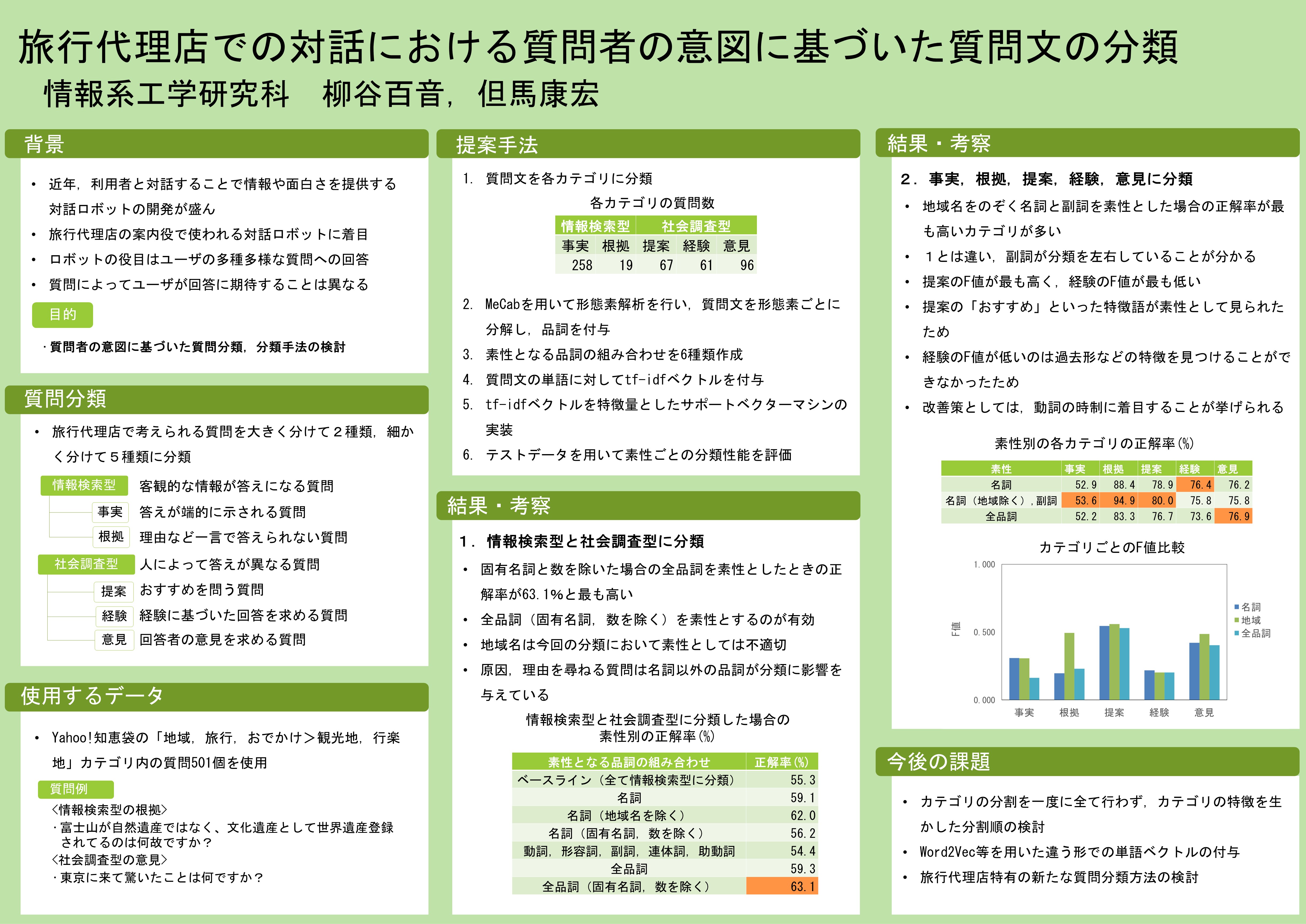 - 柳谷百音, 但馬康宏, 旅行代理店での対話における回答方法を基準とした質問分類, 言語処理学会, 第28回年次大会論文集, pp.43--47, Mar. 2022.