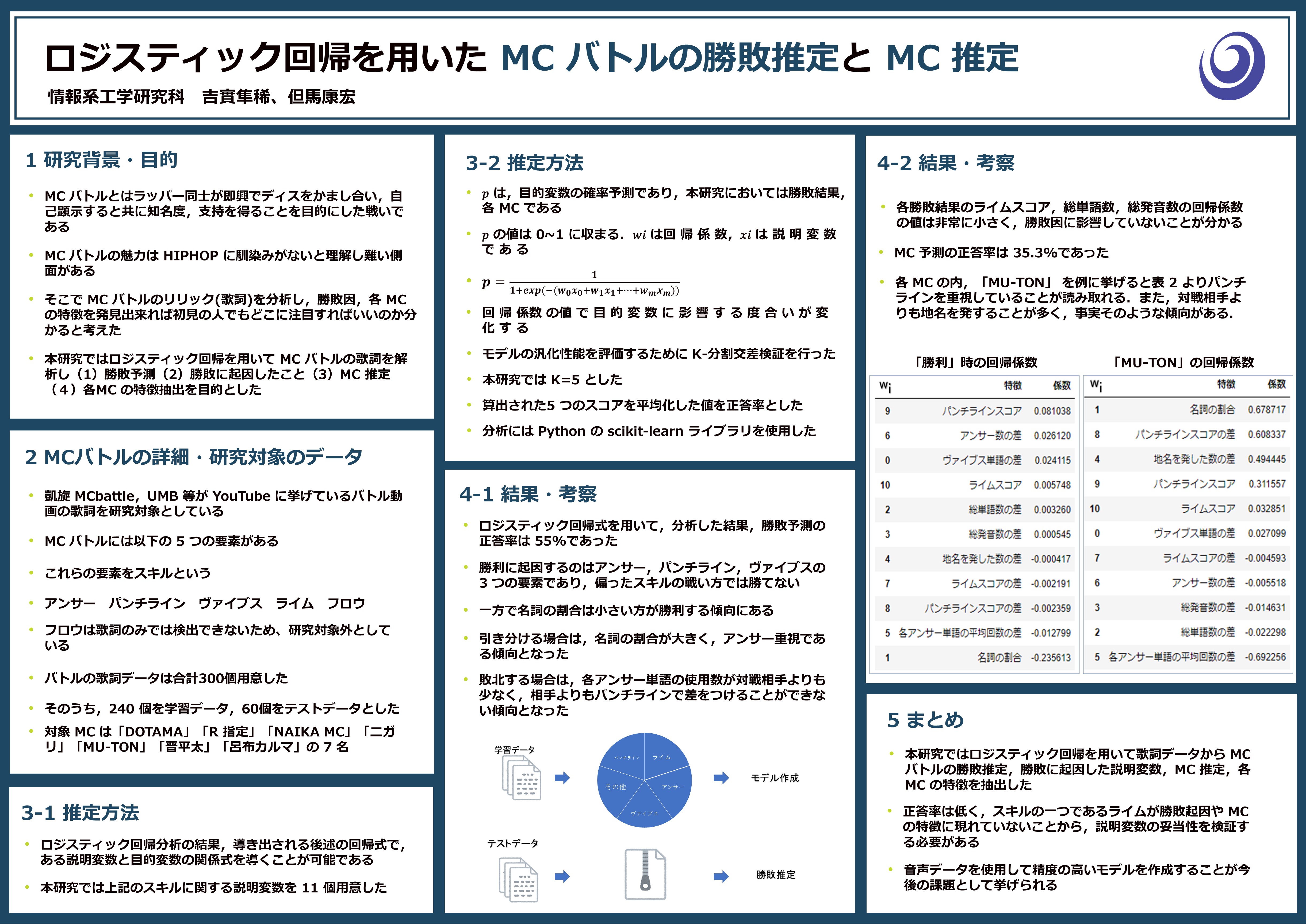 - 吉實隼稀, 但馬康宏, ロジスティック回帰を用いたMCバトルにおけるMC推定, 言語処理学会, 第28回年次大会論文集, pp.404--409, Mar. 2022.